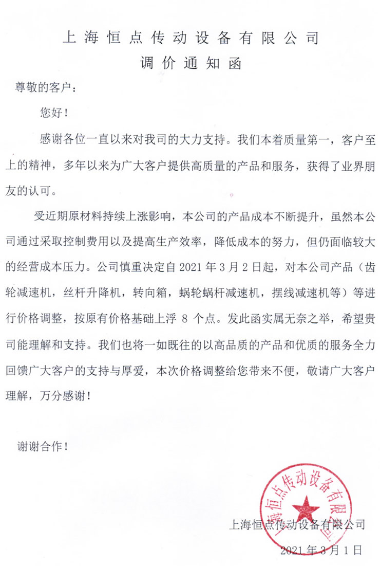 受近期原材料持續上漲影響 ,本公司的産品成本不斷提升,雖然本公司通過採(cǎi)取控制費用以及提高生産效率,降低成本的努力,但仍面臨較大的經營成本壓力。公司慎重決定自2021年3月2日起,對本公司産品(齒輪減速機,絲杆升降機,轉向箱,蝸輪蝸杆減速機,擺線減速機等)等進行價格調整,按原有價格基礎上浮8個點。發此函實屬無奈之舉,希望貴司能理解和支持。我們也将一如既往的以高品質的産品和優質的服務全力回饋廣大客戶的支持與厚愛(ài),本次價格調整給您帶來不便,敬請廣大客戶理解,萬分感謝!