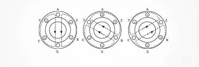 當(dāng)交流電相位θ=2400時,IC=0,IA爲負,IB爲正,此時 ,線端C、Z沒有電流,繞組AX電流從(cóng)X流進A流出,繞組BY電流從(cóng)B流進Y流出,由安培右手螺旋定則得到圖(c)中磁感線方向(如虛線箭頭所示)。
