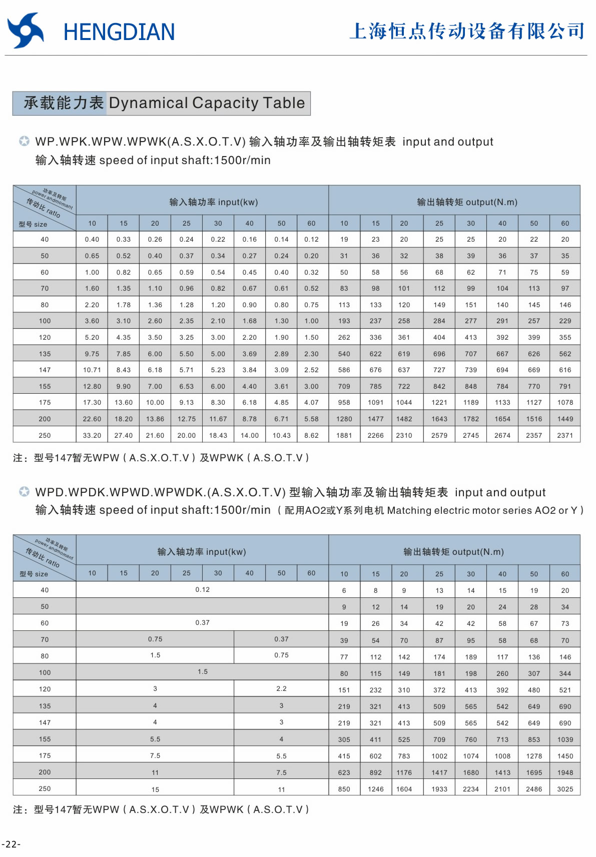 WP鑄鐵蝸輪蝸杆減速機,配置方式靈活,具有一定的自鎖能力 ,能适應多種安裝和使用的要求 ,因此使用範圍廣泛。但蝸輪蝸杆減速機本身的傳動效率不高,不如行星減速機或者齒輪減速機,所以在選用時要多方考慮。下面恒點減速機把這類減速機的承載能力表公布下,以便大家查閱: