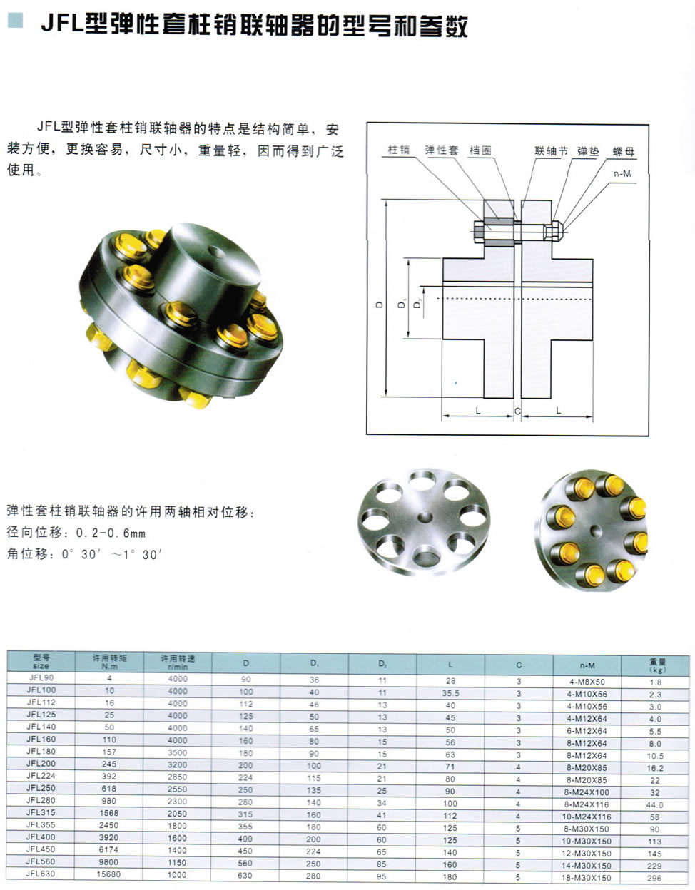 彈性套柱銷聯軸器的許用兩軸相對位移: 徑向位移 :0.2-0.6mm 角位移: 0 30' - 1 30