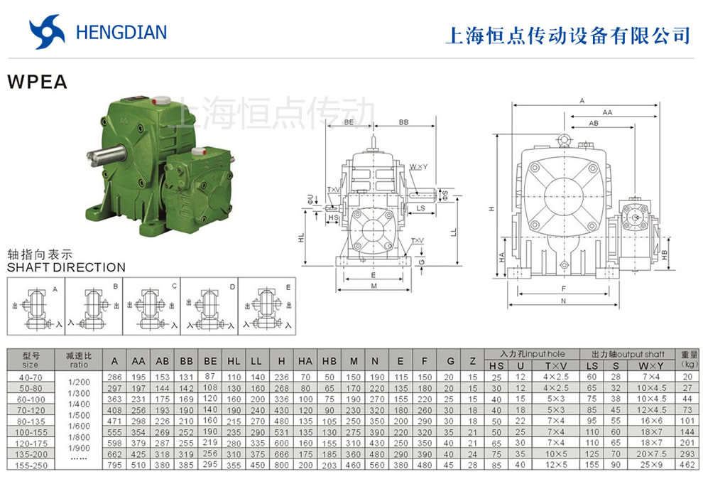 的外形安裝尺寸.WPEA雙級蝸輪蝸杆減速機選型指南,WPEA雙級減速機軸輸入,軸輸出.WPEA雙級減速機軸指向表示方法.機座号40-70到155-250,速比200到900.