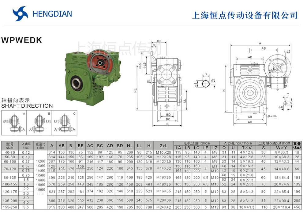 的外形安裝尺寸.WPWEDK雙級蝸輪蝸杆減速機選型指南,WPWEDK雙級減速機法蘭輸入,孔輸出.WPWEDK減速機機座号40-70到155-250,速比200到900.